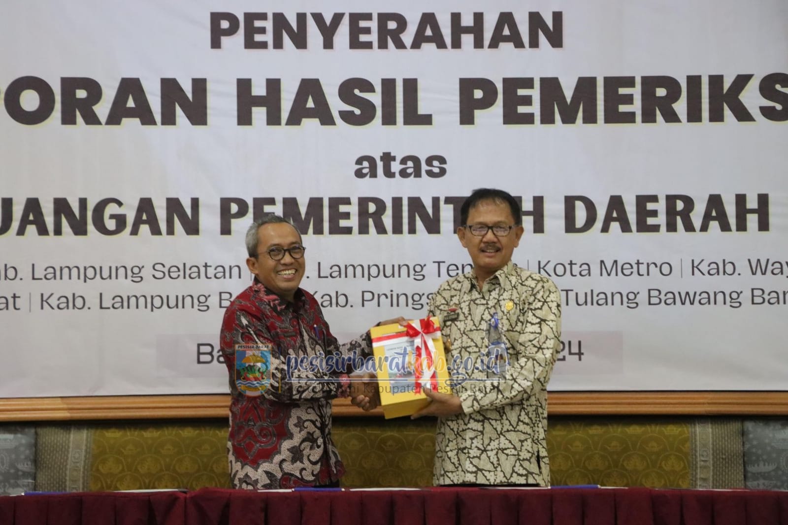 Bupati Pesisir Barat (Pesibar), Dr. Drs. Agus Istiqlal, S.H., M.H., menghadiri penyerahan Laporan Hasil Pemeriksaan (LHP) atas laporan keuangan Pemkab Pesibar Tahun 2023, di Kantor Badan Pemeriksa Keuangan (BPK) Perwakilan Provinsi Lampung, Jumat (3/5/2024).